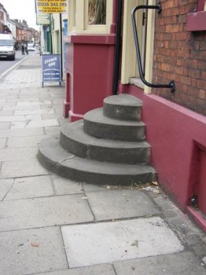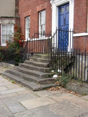 A number of properties on Church Street and some other properties have stone steps and handrails to their front doors. The reason for this is twofold, firstly the general topography of the land is sloping in a north-south direction and secondly many of the properties have basements or cellars that are only half buried. In order to achieve access to the front door, on the raised ground floor was to have stone steps. These steps allowed each building to form an impressive entrance and some are clearly more impressive than others.